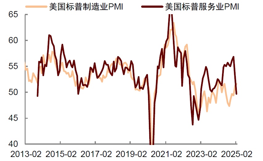 过去一周美国经济数据表现不佳:2 月份 NAHB 房产市场指数超预期下跌,创去年 9 月以来最低值(图表 1)。2 月密歇根大学消费者信心指数终值连续第三个月下跌,创 2023 年 11 月以来新低(图表 2)。2 月标普服务业 PMI 初值 49.7,为 25 个月以来首次跌破荣枯线(图表 3)。