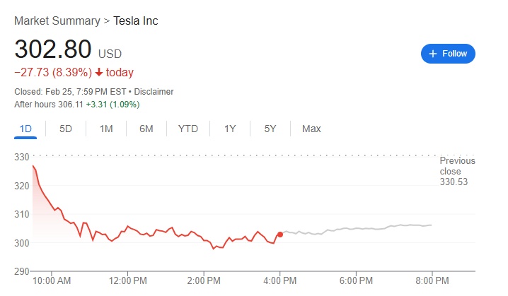 周二美股收盘,特斯拉当日重挫 8.4%,报 302.80 美元,总市值骤降至 9740 亿美元。