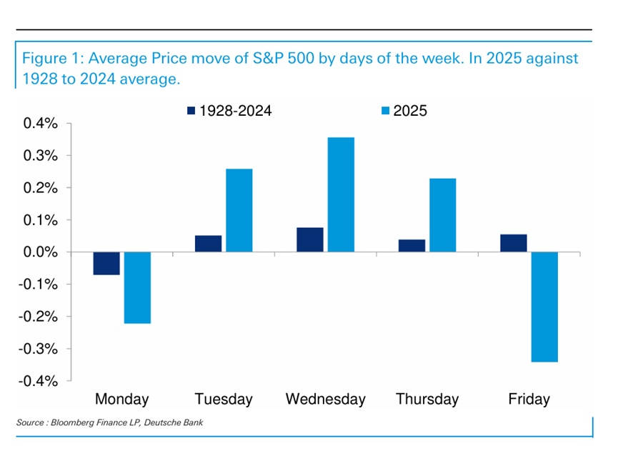 德银的图表显示了 2025 年与 1928 年至 2024 年中,标准普尔 500 指数在每周各个交易日的平均价格变化。2025 年周五,平均价格走势低于平均水平 0.4 个百分点,而历史上周五的价格走势高于平均水平近 0.1 个百分点。