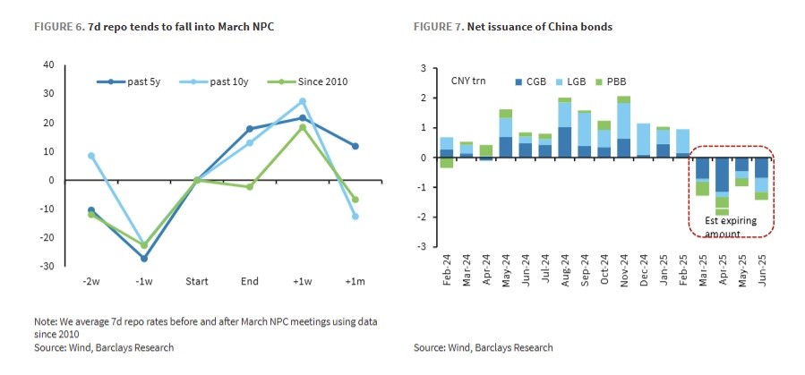 随着 3 月全国人大会议临近,央行预计将更加宽松,特别是考虑到季节性因素和大量到期的政府债券。历史数据显示,进入 3 月全国人大会议期间,7 天回购利率通常会下降。
