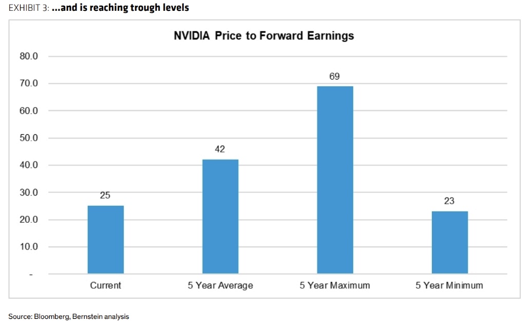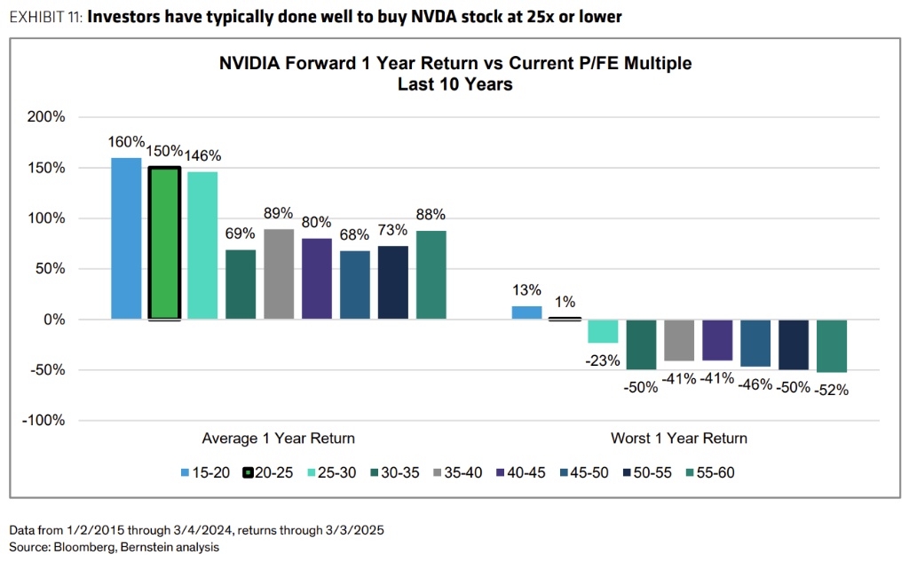 此外,从历史来看,当英伟达的市盈率跌至 25 倍或以下时,投资者通常能够获得丰厚回报(过去的平均次年回报率达 150%,且下行风险相对有限)。