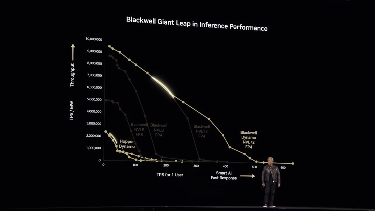 黄仁勋展示了 Blackwell 架构如何超越 Hopper 超级计算机。用 Grace Blackwell NVLink72 芯片搭载 Dynamo,Blackwell 架构相比 Hopper 架构可将性能提升 25 倍。“在推理模型中,Blackwell 的性能是 Hopper 的 40 倍。”
