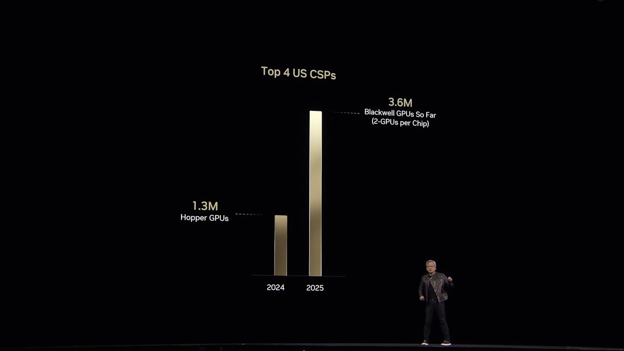 他透露,2024 年,美国前四大云服务提供商(CSP)、所谓超大规模云服务商(hyperscaler)购买了 130 万块英伟达的 Hopper 架构芯片,2025 年,又购买了 360 万 Blackwell 架构芯片。