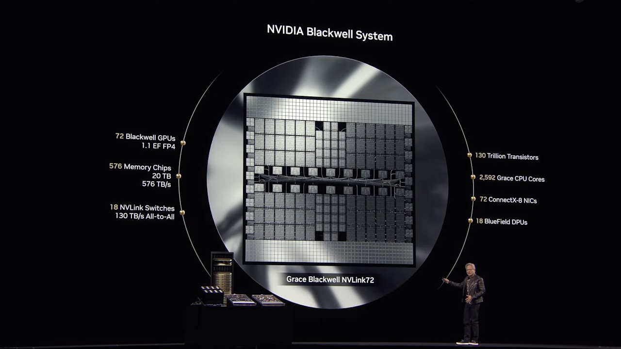 他再次展示了今年 1 月 CES 上他演示的超级芯片 Grace Blackwell NVLink 72。它在一个晶圆上集成了 72 个 Blackwell GPU,并且有 18 个 NVLink Switch,实现 4 位浮点数 FP4 上 1.4 EFLOPS 的计算性能。