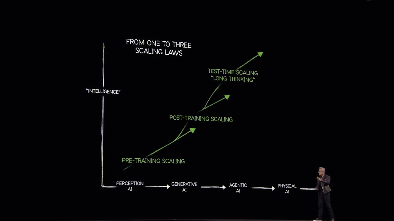 黄仁勋说,现在我们正在了解如何扩展 AI,未来必须关注训练和扩展构建的 AI 模型。他介绍 AI 的扩展定律(scaling law)发展演化,从预训练扩展、训练后扩展到测试时间扩展,即 “长思维”。