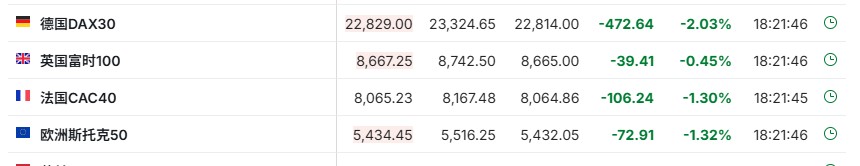 周四欧股普遍下挫,德国 DAX 指数跌超 2%,欧洲斯托克 50 指数、法国 CAC 40 指数跌超 1%。其中,国防股大幅回调,蒂森克虏伯跌近 8%,莱茵金属跌超 5%。