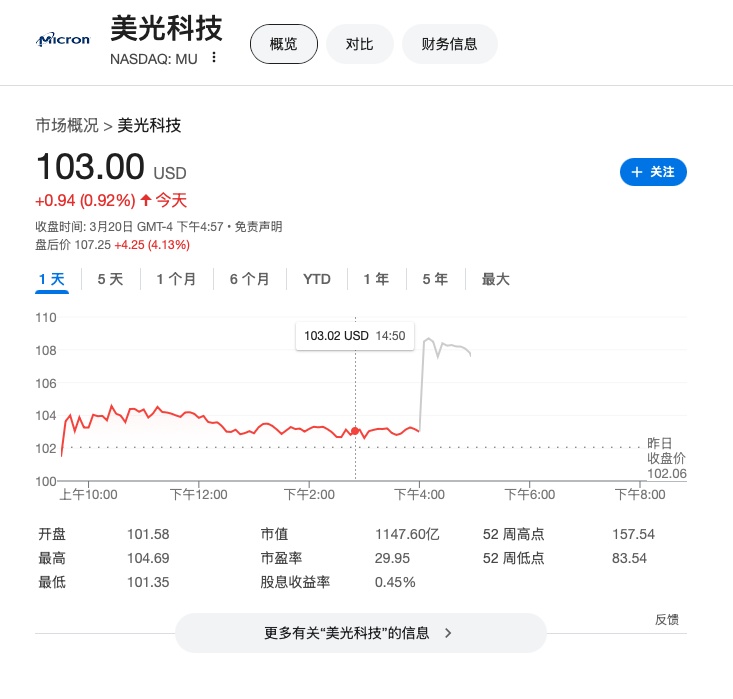 美光周四收盘上涨 0.92%,报 103 美元。在公布业绩预测后,该公司股价在盘后交易中一度涨超 5%,后回落至 4% 左右。截至周四收盘,今年以来美光股价已上涨约 22%,而半导体行业整体表现低迷。相比之下,费城半导体指数今年迄今已下跌 7.6%。