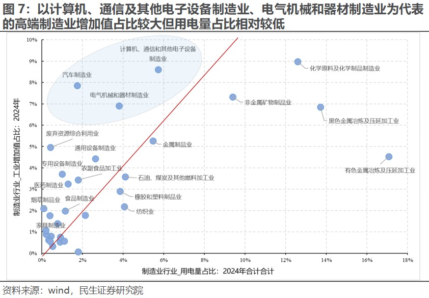 (2)受到经济结构转型的影响,单位增加值耗电量低的高端制造业增加值占比逐步抬升。2024 年制造业中工业增加值占比排名靠前的行业主要有化学原料及化学制品制造业、计算机、通信和其他电子设备制造业、汽车制造业、非金属矿物制品业、电气机械和器材制造业以及黑色金属冶炼及压延加工业,但明显传统行业的用电量占比更高,尤其是有色金属冶炼及压延加工业,用电量占比最大但是工业增加值占比却较低。可以看到在经济转型趋势之下,2021 年以来高端制造业增加值占比逐步抬升,高耗能产业占比有所下降,这也会导致用电量和工业增加值的背离。
