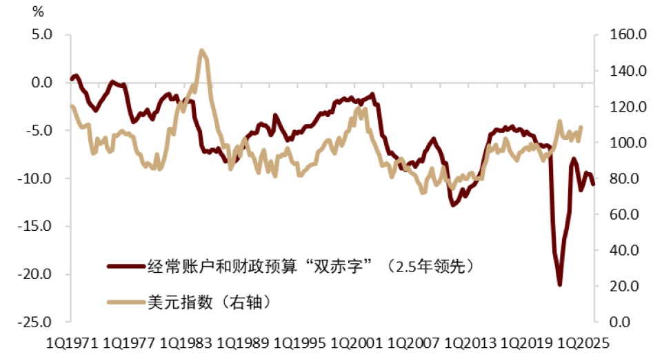 一个是金融市场的巨大风险:高债务。这在 “里根大循环” 里就曾演绎过一遍,天量财政刺激推动经济高增长和美元升值,往往带来贸易赤字的恶化,叠加财政赤字短期难以收敛,双赤字问题终将引发投资者关注甚至担忧。当美国双赤字超过某一阈值一定时间后,在某些催化剂下,往往触发美元开启长周期贬值。