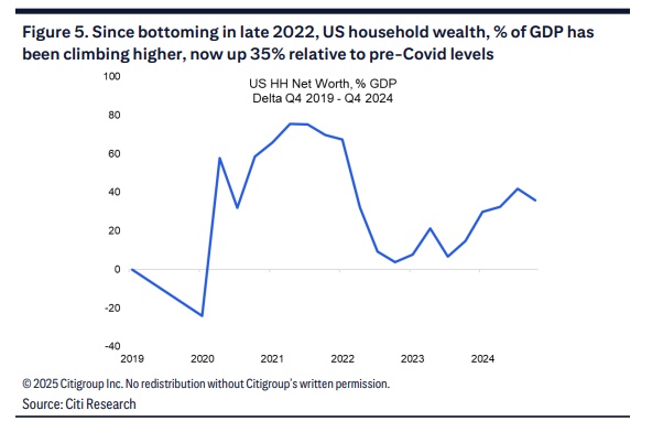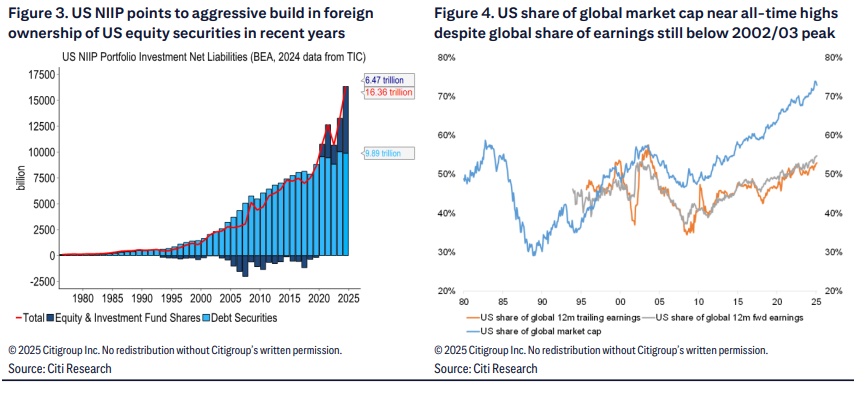 报告指出,全球投资者对美国资产的持仓从未如此之高,尤其是美国股票。花旗研究显示,全球投资者对美国资产的超配程度前所未有,这种配置是购买流动和相对价格大幅跑赢的混合结果。这使美国在股票市场可能出现持续下跌时尤为脆弱,因为美国股票市场支撑了美国双赤字的很大部分,并占家庭财富的 30%。