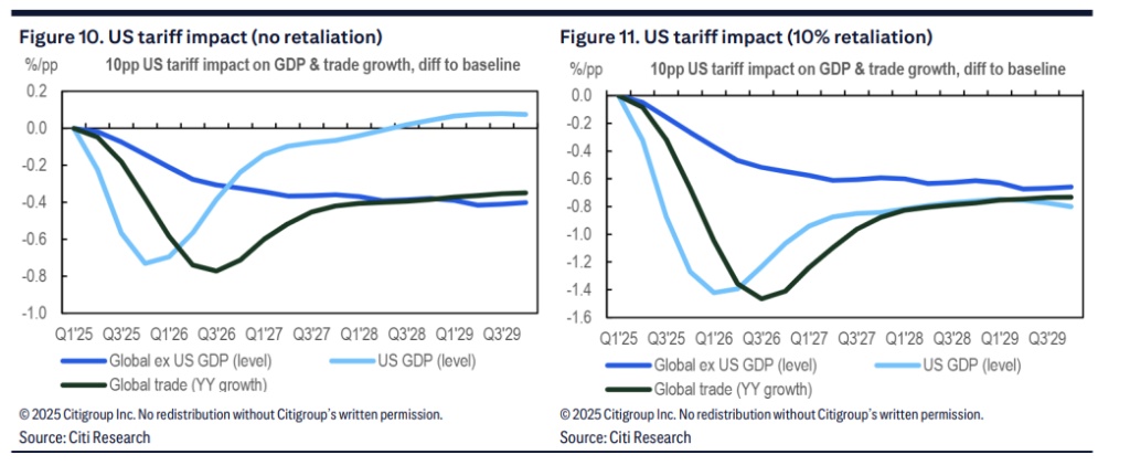 如果美国提高关税后,主要贸易伙伴也采取同等幅度的报复性关税,花旗的经济模型显示,美国的 GDP 增长可能会在第一年下降 0.5% -0.7%,并且在后续几年内难以恢复到之前的增长水平。