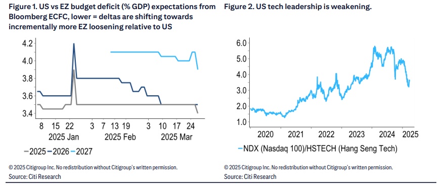 4 月 2 日,美国新一轮关税政策即将落地。花旗认为,这或成为 “贸易战 2.0” 的阶段性节点,而非终点。新一轮贸易战可能成为触发资本流向逆转的导火索,特别当欧洲财政政策转向宽松、美国消费者支出疲软之际。短期市场可能因关税冲击出现 “膝跳反应”——美元走强、美股与美债收益率承压,但长期风险在于贸易战对美经济增速的拖累被低估。