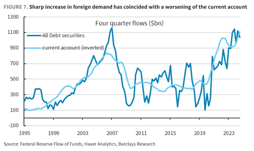 外国投资者对美国债务证券(国债、机构债、地方债和公司债)的购买量,与美国经常账户赤字之间的密切关系