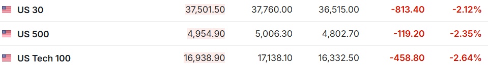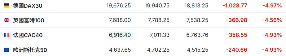 2. 截至发稿,德国 DAX 指数跌 4.97%,英国富时 100 指数跌 4.56%,法国 CAC40 指数跌 4.93%,欧洲斯托克 50 指数跌 4.93%。