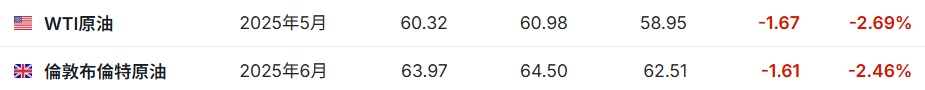 3. 截至发稿,WTI 原油跌 2.69%,报 60.32 美元/桶。布伦特原油跌 2.46%,报 63.97 美元/桶。