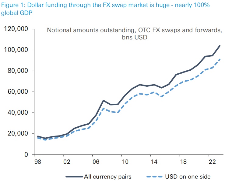 德银表示,美联储的美元互换额度控制着规模约 97 万亿美元的外汇掉期市场,相当于全球 GDP 总和,是危机时期非美国机构获取美元流动性的生命线。