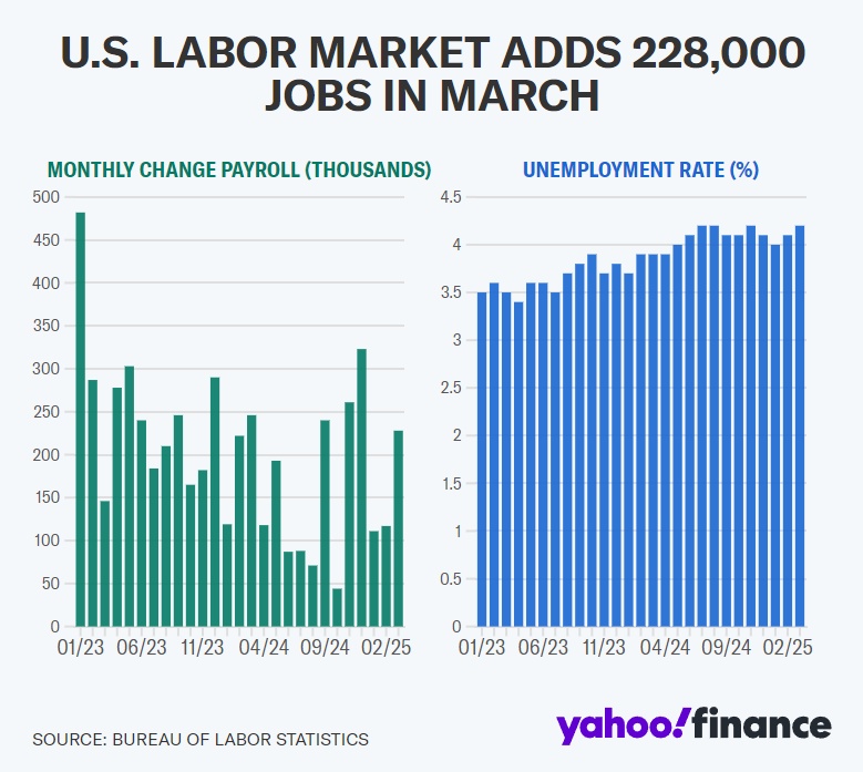 数据显示,4 月非农就业人数预计新增 13.3 万,失业率料维持在 4.2%。相比之下,美国经济 3 月新增 22.8 万个就业岗位,而失业率上升至 4.2%。