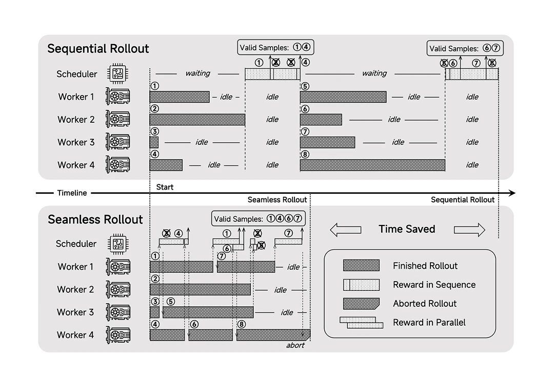 - 框架:设计了 Seamless Rollout 系统,使得 RL 训练加速 2.29 倍,验证加速 1.96 倍。