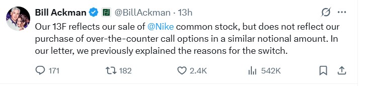 与此同时,Ackman 完全清仓了此前持有的 1876.9 万股耐克股票,但购买了约等值的场外看涨期权。Ackman 发推表示,在我们的信中,我们之前已经解释了进行这种转换的原因。值得注意的是,这是赶在特朗普所谓 “对等关税” 前采取行动。
