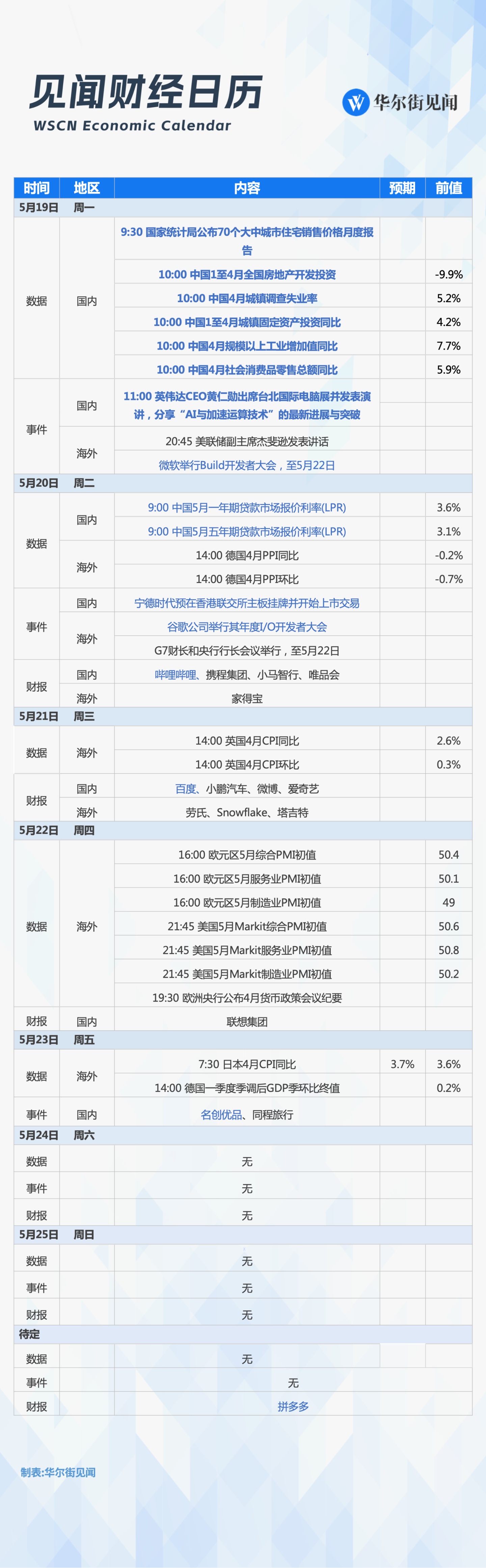本周重点关注:中国公布 4 月社零、房地产投资等经济数据以及 5 月 LPR 报价,标普全球公布主要经济体 PMI 指数,宁德时代在港股上市,微软、谷歌举办开发者大会,黄仁勋发表演讲。