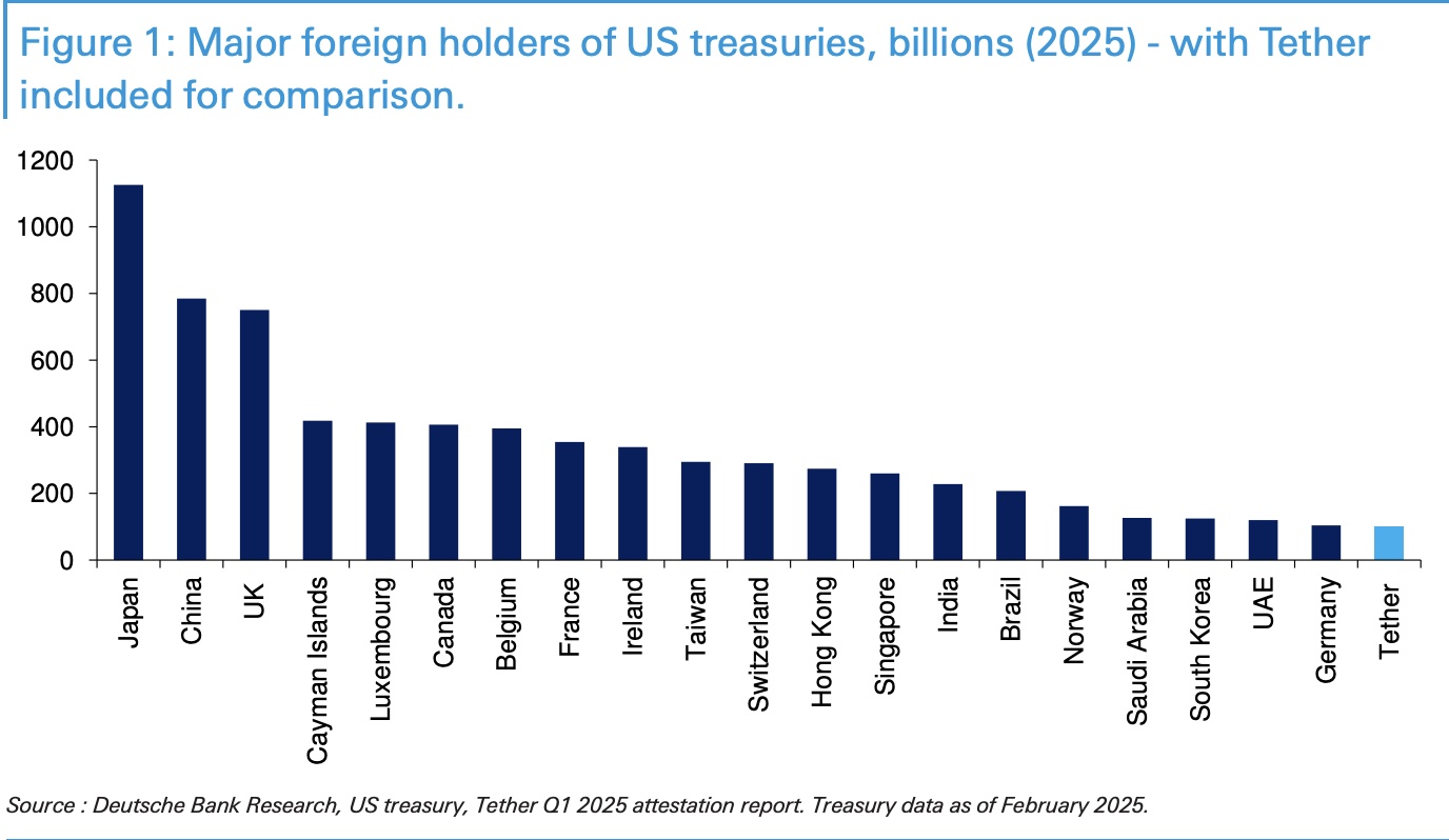 截至 2025 年 3 月,Tether 持有的美国国债已达到 985 亿美元,这一数字在 2020 年几乎为零,现已跻身美债主要海外持有者行列。