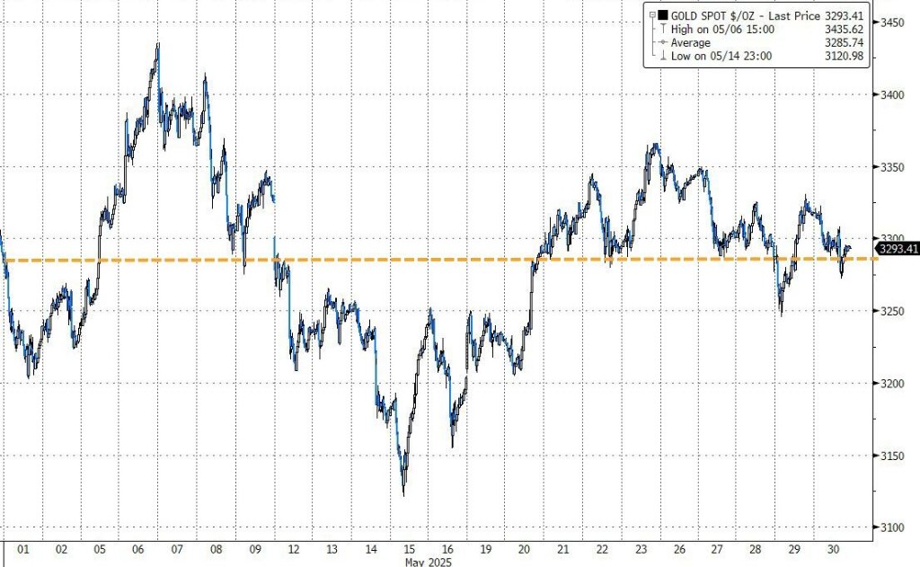 纽约尾盘,现货黄金跌 0.83%,报 3290.55 美元/盎司,5 月份累计上涨大约 0.10%。