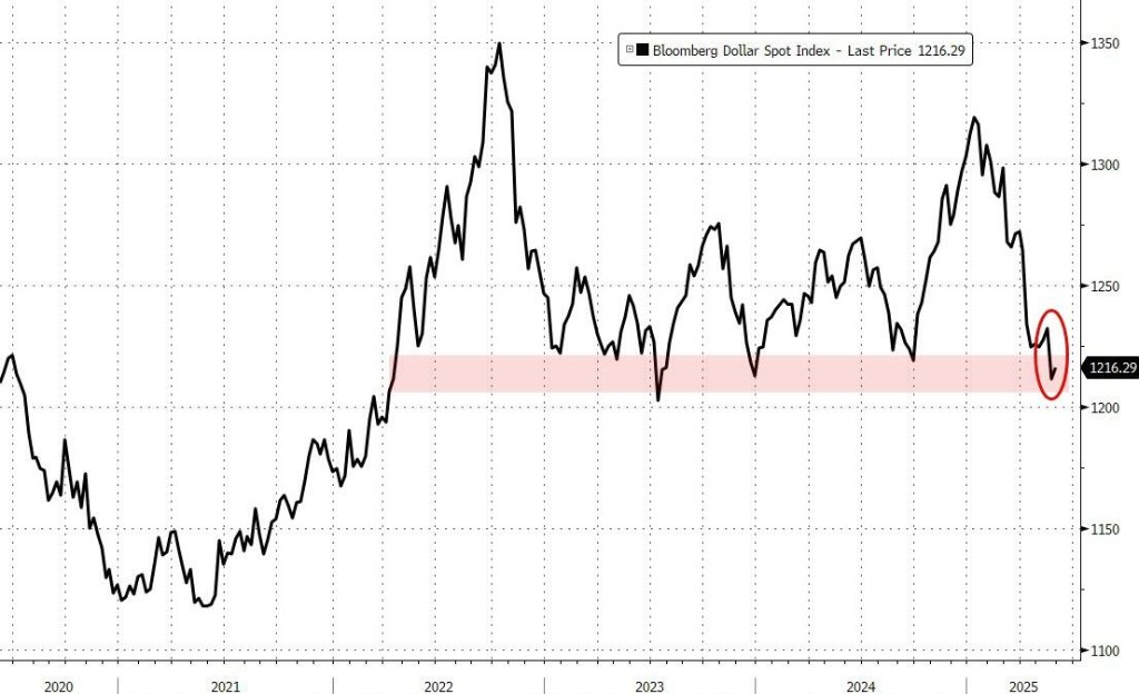 美元连续第五个月下跌,跌至三年低点的支撑位,彭博美元指数 5 月份累跌超 0.6%。