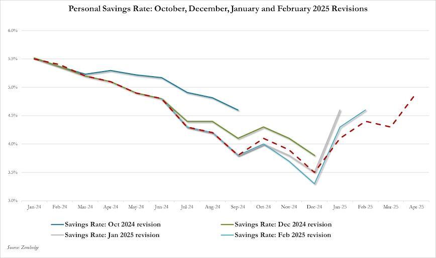 由于收入表现优于支出,储蓄率强劲反弹至 4.9%,为 2024 年 4 月以来的最高水平。
