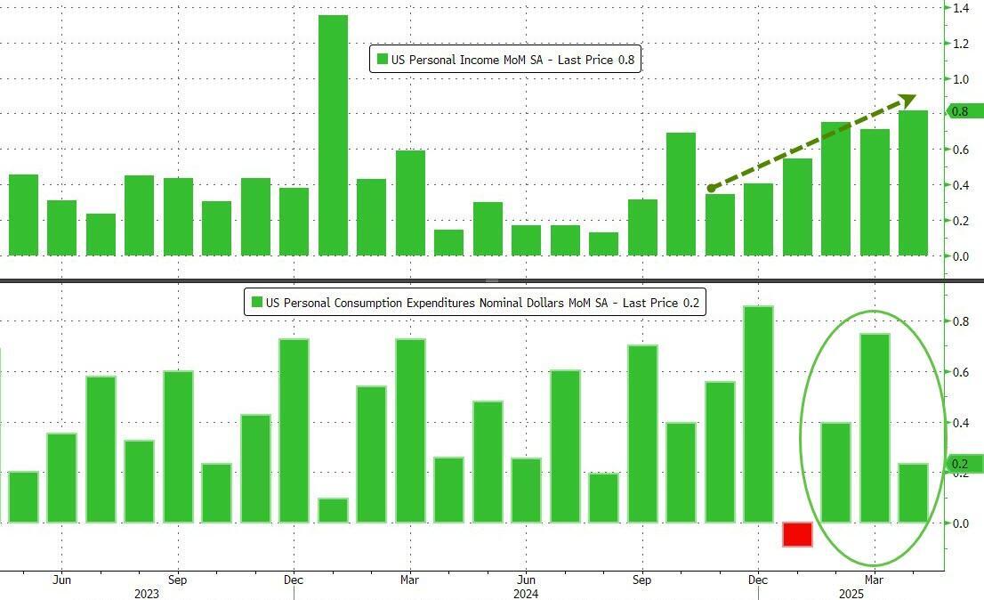 个人收入依然坚挺,环比增长 0.8%,为 2024 年 1 月以来的最大增幅,超出预估的 0.3%,其中政府和私营部门员工的薪酬都在加速增长。