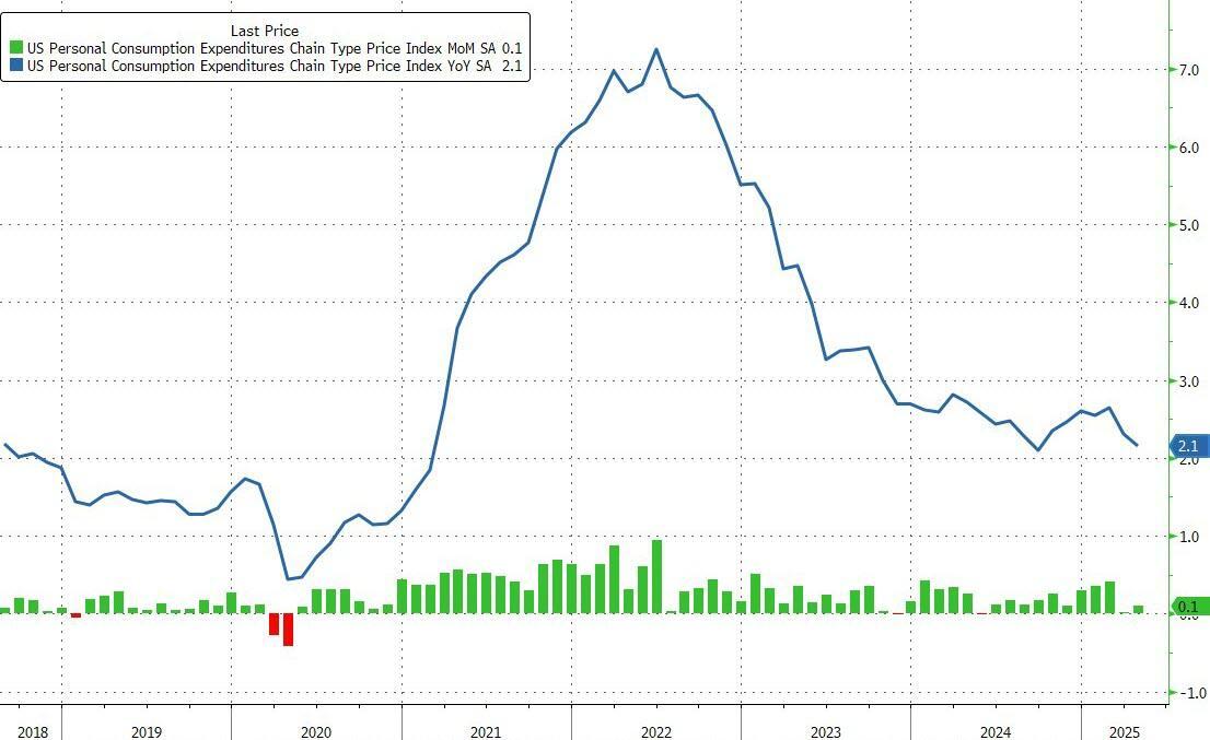 美国 4 月 PCE 物价指数同比上涨 2.1%,不及预期 2.2% 和前值 2.3%;PCE 物价指数环比上涨 0.1%,持平预期,前值为 0%。