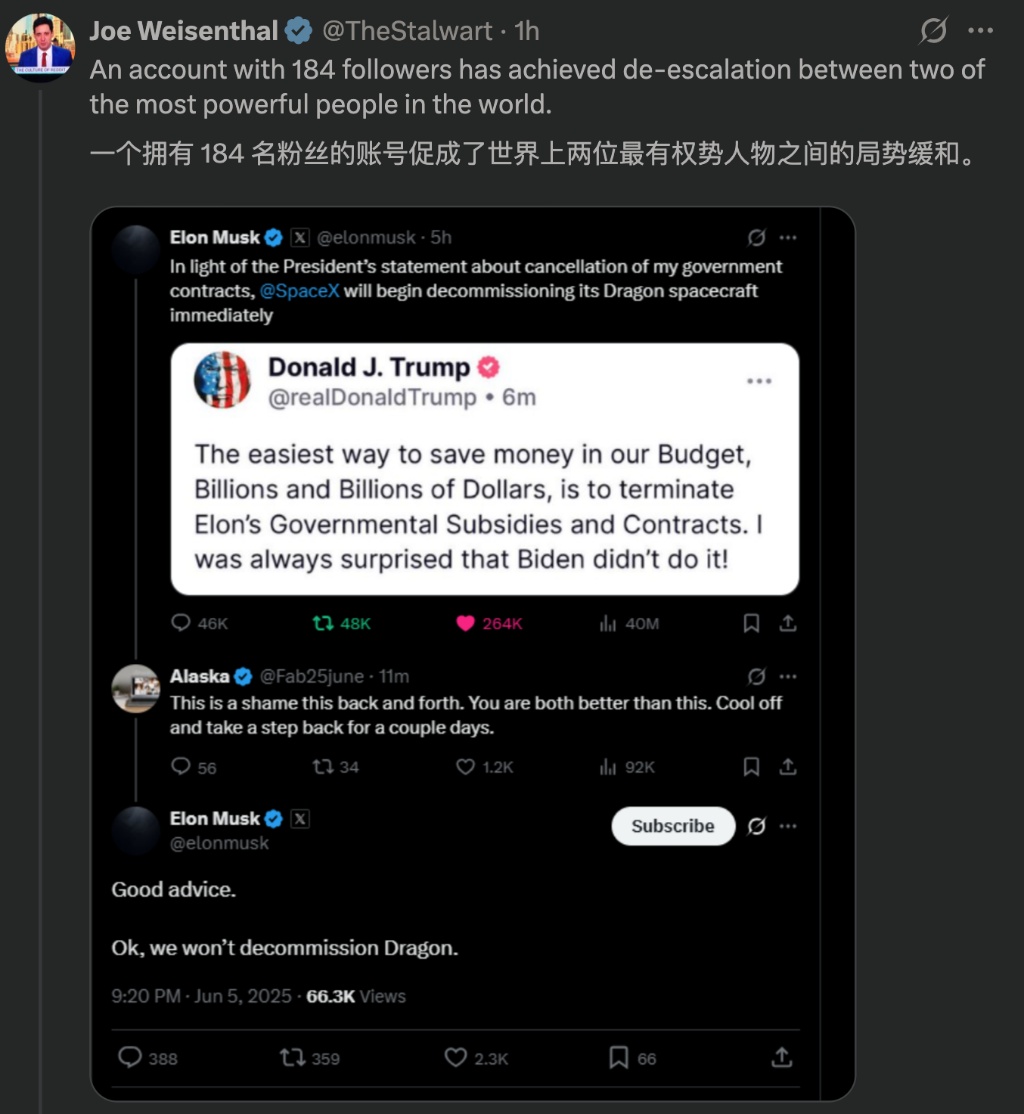 这一微妙的表态被市场解读为和解的积极信号,表明马斯克对缓和紧张关系持开放态度。知名媒体人 Joe Weisenthal 感慨,一个只有 184 粉丝的小账号 “推动了全球最有权势的两个人的缓和”。
