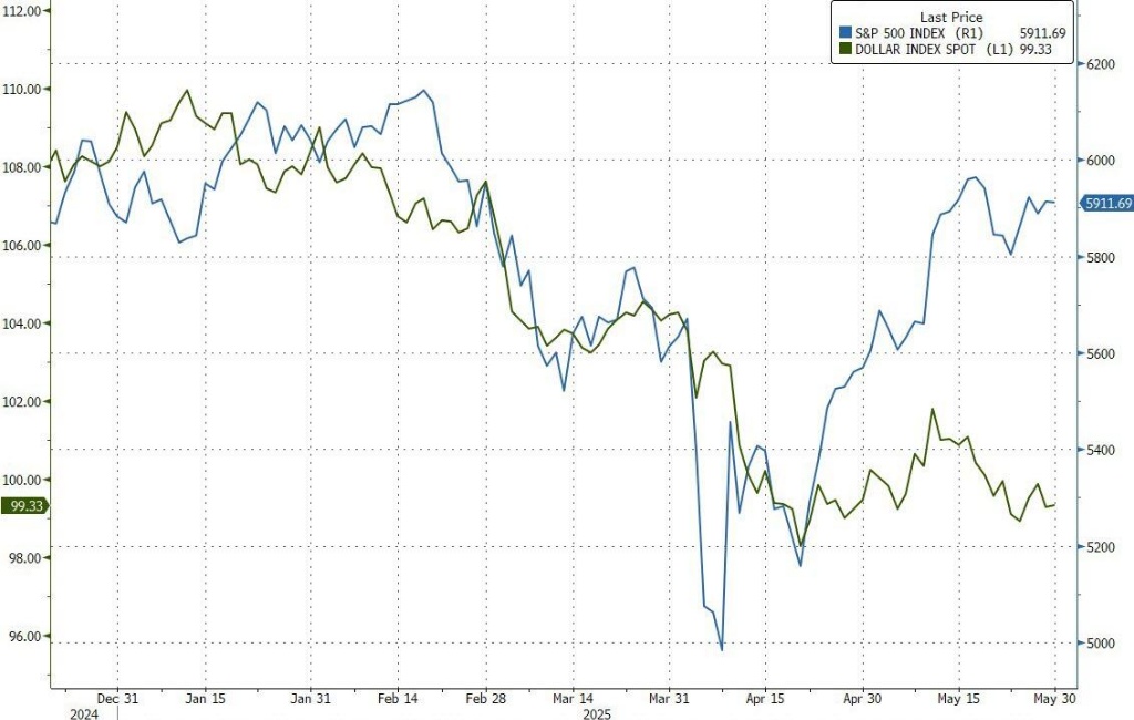 更令人担忧的是,汇率因素正成为日益重要的变量。数据显示,标普 500 与德国 DAX 指数在绝对回报方面的差距约为 20%,但在汇率调整后,这一差距扩大至约 30%。多年来首次,美元敞口正成为阻力而非助力。这一变化背后是美国 30 年期国债收益率逼近 5%,穆迪下调美国信用评级,长期国债拍卖表现疲软(投标倍数创 2012 年来新低),以及外国投资者对美国长期债券需求的明显下降。