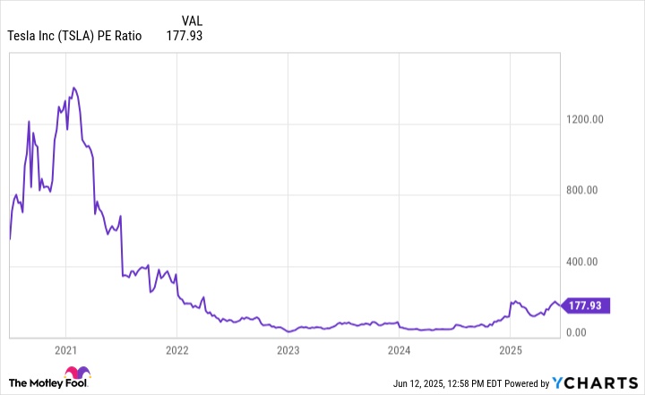 TSLA 市盈率数据来源于 YCharts。