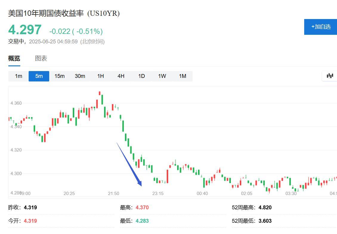 鲍威尔提及提前降息的可能、以及暗示关税对通胀影响若低于预期将推动降息后,美股早盘尾声时,美国国债收益率持续下行。午盘基准 10 年期美国国债收益率下破 4.30%,对利率更敏感的两年期美债收益率下破 3.81%,均在鲍威尔听证会结束后刷新一个多月来低位。评论认为,本次听证会上,鲍威尔并未排除 7 月降息的可能,且更重要的是不排除通胀可能会减弱。