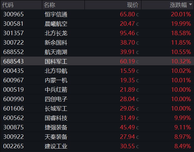 自 6 月中旬以来,军工股持续暴涨,上半年最后一个交易日再度掀起涨停潮,恒宇信通、晨曦航空 20% 涨停,长城军工、利君股份、光电股份、中航沈飞等纷纷上扬。