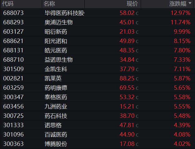 午后 CRO 概念拉升,截至收盘,毕得医药科技股、奥浦迈生物等涨超 10%,昭衍新药涨停,阳光诺和、皓元医药等走高。