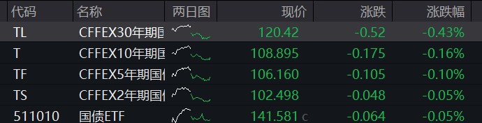 债市:国债期货全线下跌,截至收盘,30 年期主力合约跌 0.43%,10 年期主力合约跌 0.16%,5 年期主力合约跌 0.10%,2 年期主力合约跌 0.05%。