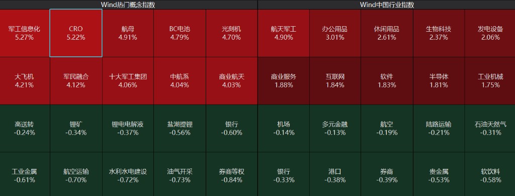 盘面上,个股涨多跌少,沪深京三市超 4000 股飘红,板块方面,军工板块再度上演涨停潮,CRO 概念午后大涨,稳定币概念、半导体产业链等盘中活跃,银行、油气等板块跌幅居前。