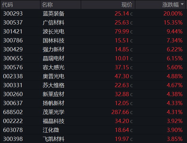 光刻机概念早盘异动,截止收盘,蓝英装备 20CM 涨停,广信材料涨超 15%,波长光电、国林科技、强力新材等跟涨。
