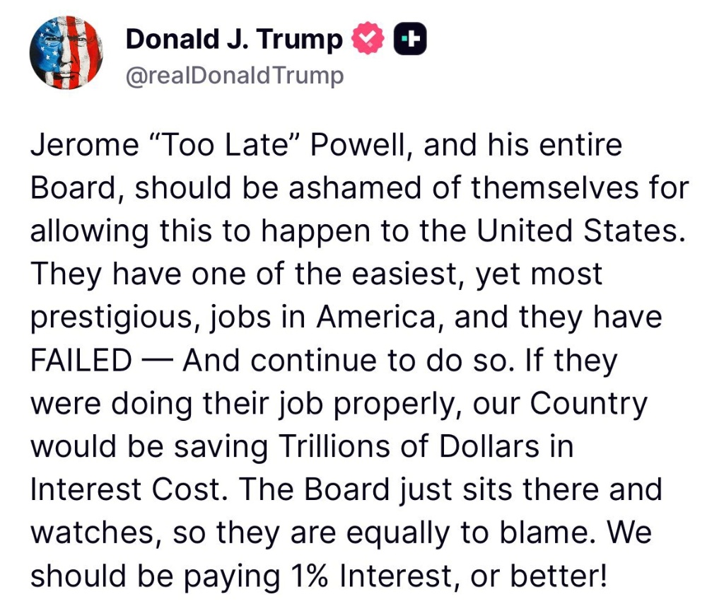 与此同时,特朗普在社交媒体上将矛头指向了整个美联储理事会,称鲍威尔及其同事 “应该为让这种事发生在美国身上而感到羞耻”。这延续了他数月以来对鲍威尔的攻击,此前他曾直接侮辱鲍威尔,甚至威胁要将其解雇,并在上周五公开喊话让鲍威尔辞职。