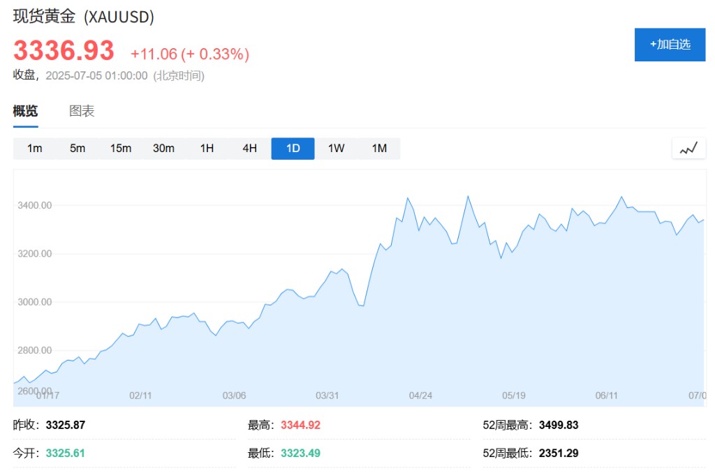 纽约尾盘,现货黄金最终上涨 0.33%,报 3337.15 美元/盎司,本周累计上涨 1.92%。