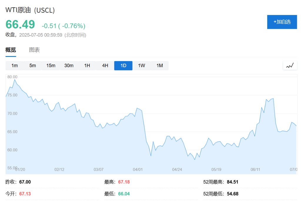 纽约尾盘,WTI 原油期货跌 0.76%,报 66.49 美元/桶。