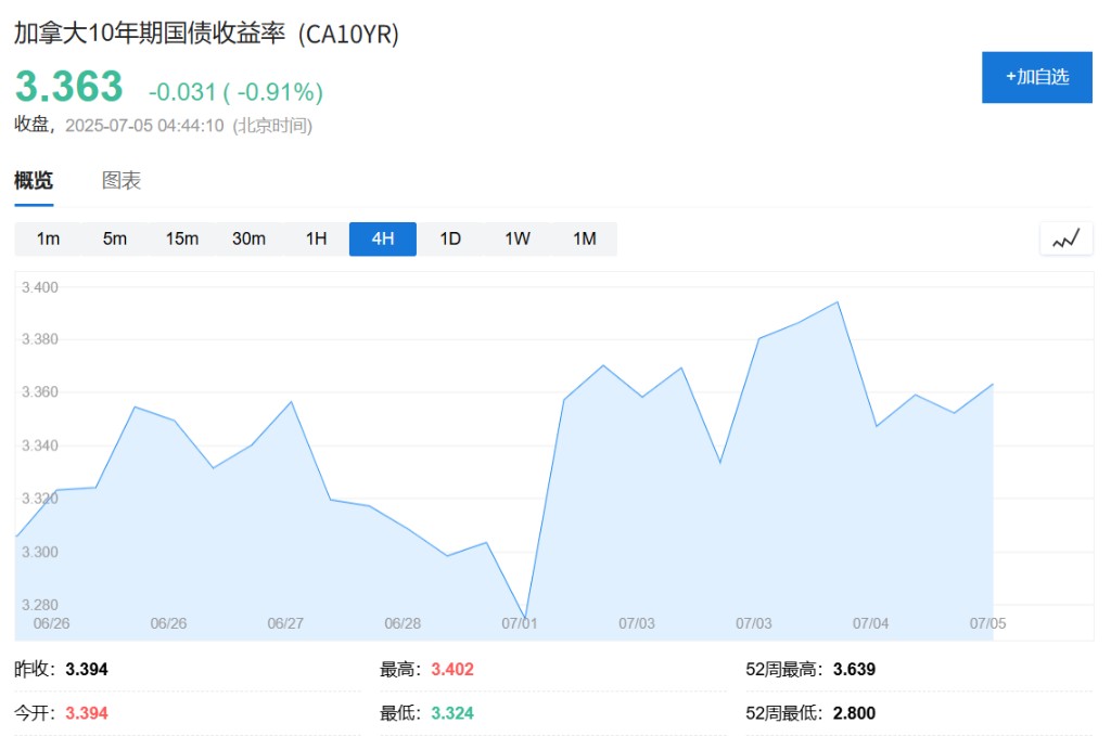 北美尾盘,加拿大 10 年期基准国债收益率本周累涨 4.9 个基点,两年期加债收益率累涨 6.4 个基点。