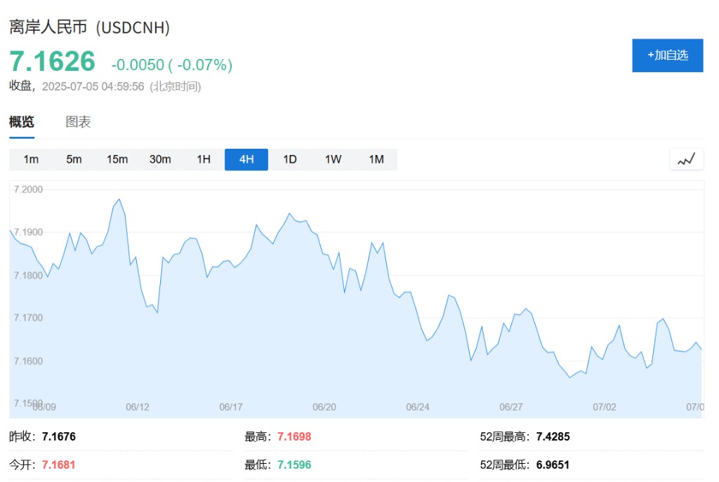 纽约尾盘,美元兑离岸人民币报 7.1633 元,较周四纽约尾盘涨 70 点,日内整体交投于 7.1709-7.1605 元区间。