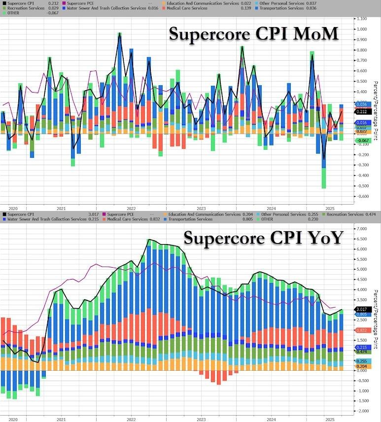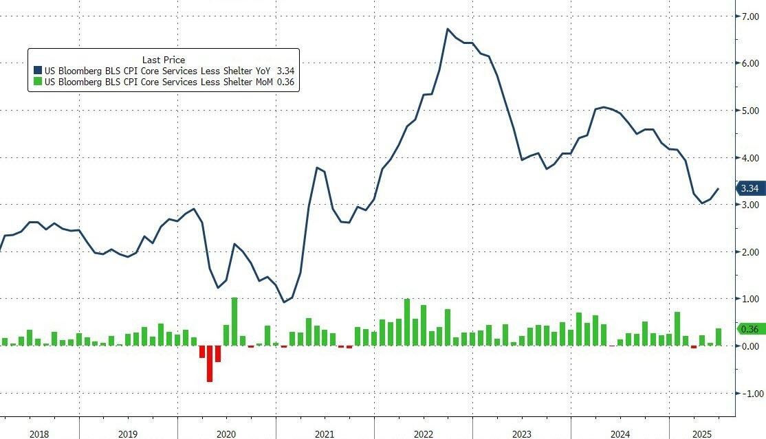 所谓的超级核心 CPI(不含住房在内的服务业成本)环比上涨 0.36%,同比上涨 3.34%,为 2 月以来最高,但远低于年初至今的最高水平。