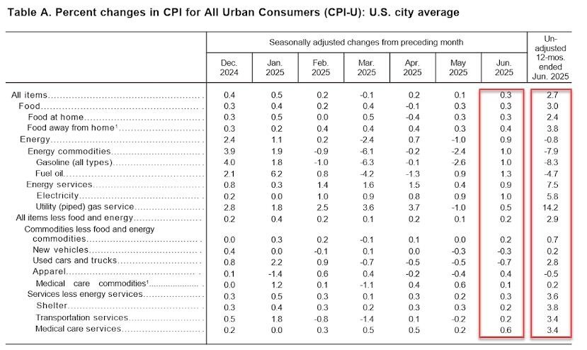 与此同时,美国 6 月核心 CPI 同比上涨 2.9% 符合预期,高于前值 2.8%;环比涨幅从前月的 0.1% 小幅回升至 0.2%,但低于预期 0.3%,为连续第五个月低于预期。
