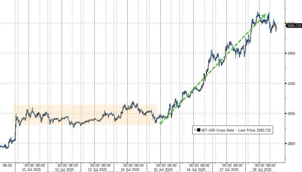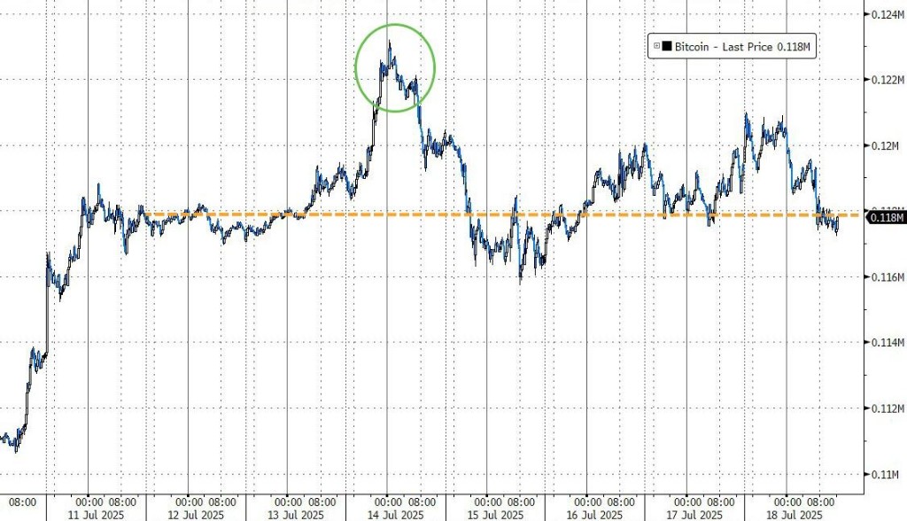 特朗普推动对欧盟征收更高关税,8 月 1 日前多行业关税将至,美国消费者通胀预期改善,美股涨跌不一。科技股表现优异,支撑纳指收涨、盘中再创新高。2 年期美债收益率一度跌约 4 基点。特朗普签署稳定币法案,加密货币市场总市值周五首次突破 4 万亿美元。以太坊日内曾站上 3600 美元,连续第四周表现优于比特币。