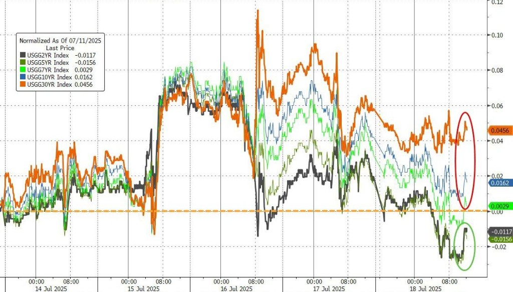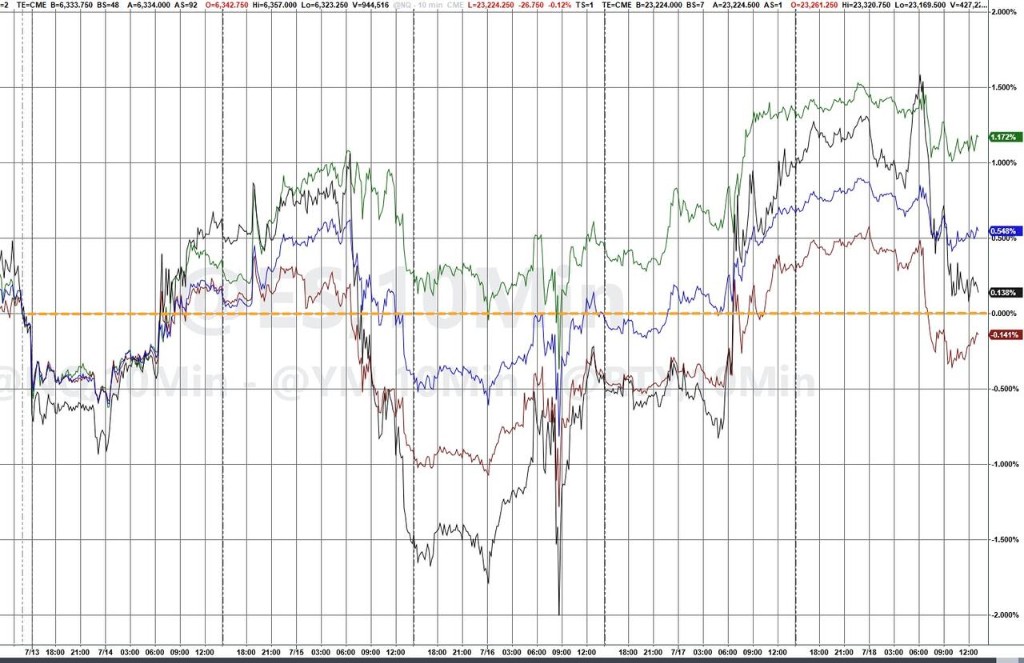 科技股表现优异,支撑纳指微涨 0.05%、盘中再创新高。奈飞财报后跌 5.1%。美联储理事沃勒支持 7 月降息,2 年期美债收益率一度跌约 4 基点。特朗普签署稳定币法案,以太坊日内一度站上 3600 美元,连续第四周表现优于比特币,比特币高位回落 1.6%。黄金涨 0.22%。原油倒 V 反转,一度涨约 2%,随后大幅下跌抹去日内涨幅。