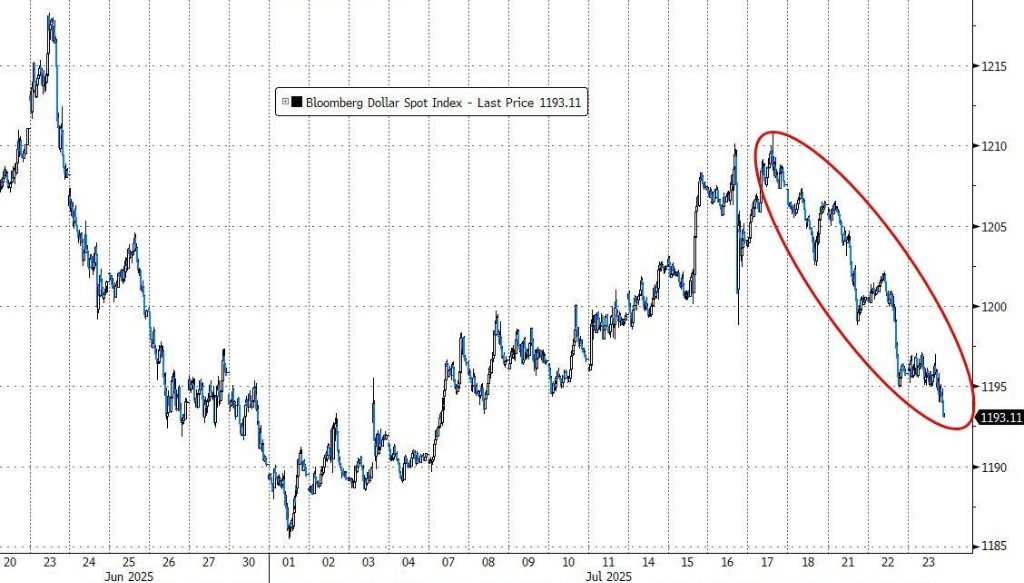 - 美股午盘,白宫贸易顾问纳瓦罗置评媒体关于欧美接近达成加征 15% 关税协议的报道,称 “我根本不相信”。欧元兑美元短线转跌,但很快小幅转涨、涨破 1.1770,刷新 7 月 7 日以来高位。纳瓦罗 “泼冷水” 后,纳指涨幅短期回落,但随后继续上行,最终收涨 0.61%、收创新高。