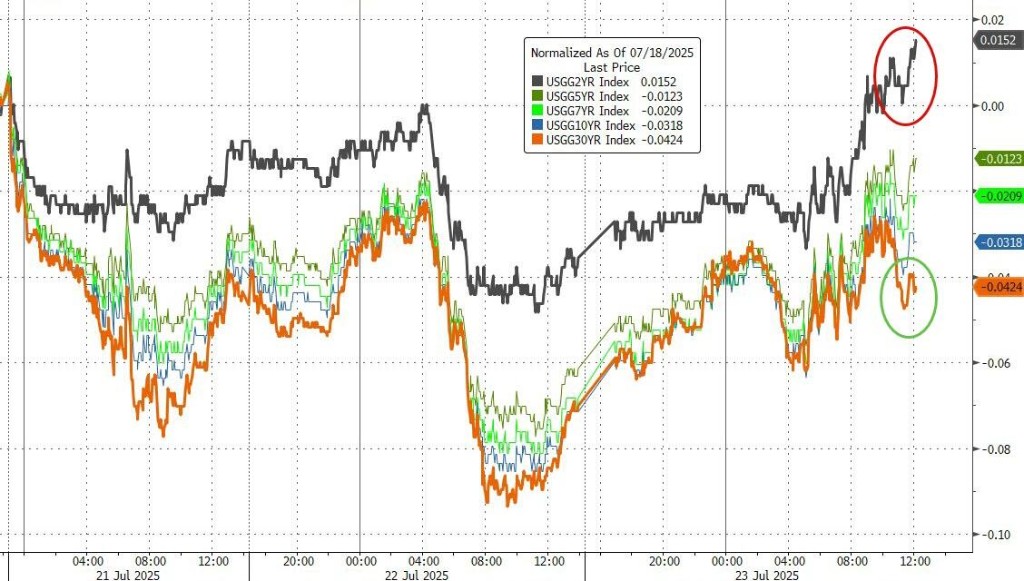长端英债收益率涨超 8 个基点,中长期德债收益率至少涨 5 个基点,美国总统特朗普宣布与日本达成贸易协议之后,“跳空高开”,全天属于上涨状态,媒体报道称欧美接近达成 15% 关税协议之后,10 年期德债收益率从 2.6% 一线迅速拉升至 2.640% 刷新日高。